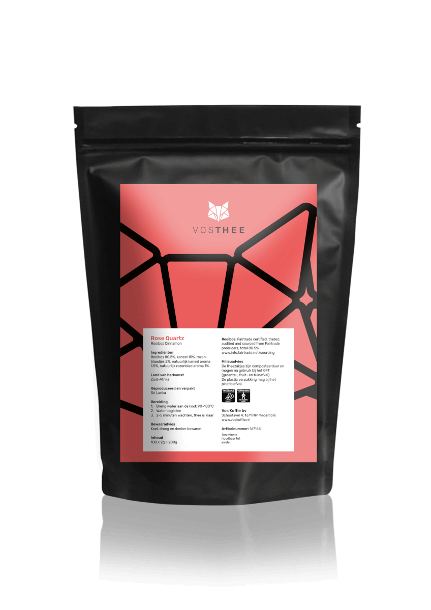 Breng een moment van rust en verfijning in je dag met Rose Quartz, een luxe thee van Vos Koffie. Deze harmonieuze blend combineert de natuurlijke zoetheid van Zuid-Afrikaanse rooibos met de verwarmende kruidigheid van kaneel en de delicate bloemige aroma’s van rozenblaadjes. Het resultaat is een thee met een rijke, gelaagde smaak – perfect voor een ontspannen moment.